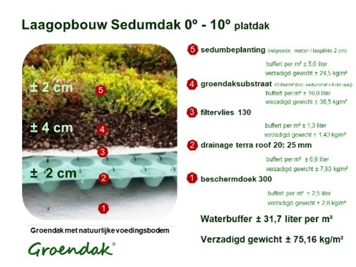 Het waterbergende vermogen is ca 31,7L/m2 en heeft een verzadigd gewicht van 75kg/m2. Totale opbouwhoogte is is zo’n 8-9cm.