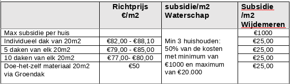 B. Voor inwoners van gemeente Wijdemeren is er een subsidie van €25/m2 met een minimum van 6m2 en maximum van €1.000 per adres. Deze gemeentelijke subsidie is niet te combineren met de subsidie van het waterschap.